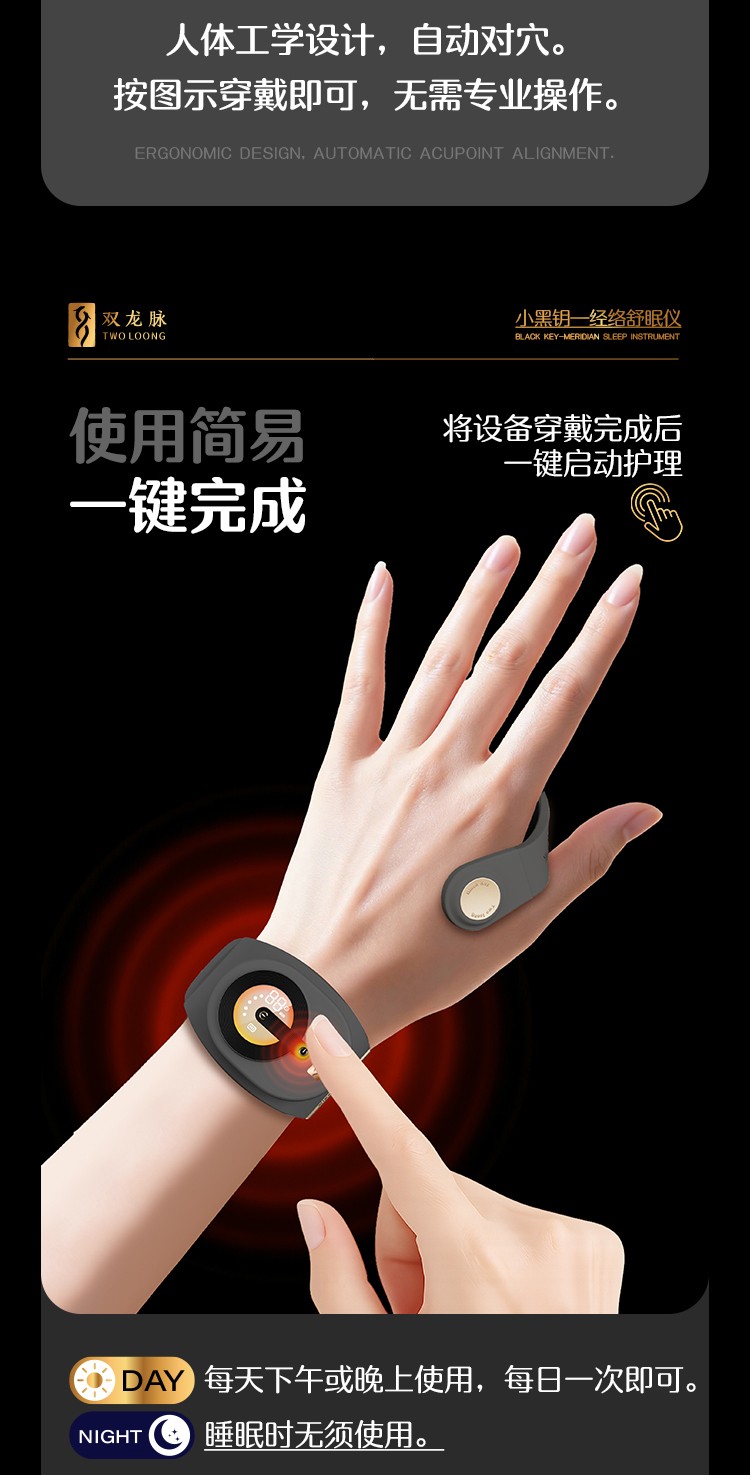 产品介绍:采用人体工学u型设计,左手佩戴后,u型端自动固定虎口,双导头精准贴合穴位,磁吸表带一扣即稳,无需手动找穴,操作零门槛。长按2秒开机,支持2-5档强度调节,调至轻微酥麻感即可,48分钟自动关机,通勤、办公、带娃间隙均可使用,睡眠时无需佩戴,不影响翻身。